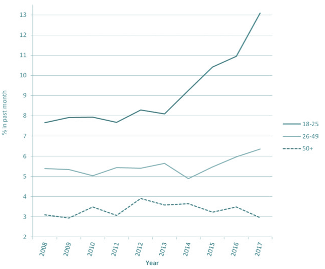 Grafikon prikazuje: Postotak pojedinaca sa ozbiljim psihološkim poremećajem u posljednjem mjesecu, a prema godinama starosti, 2008--2017. u SAD-u.